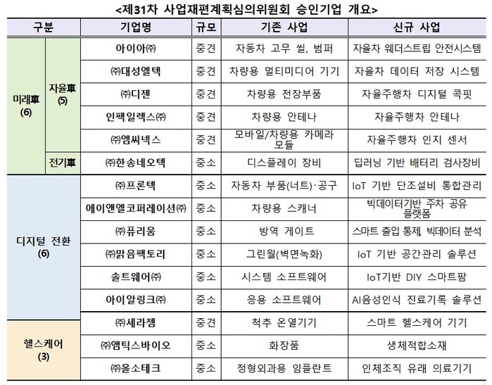 이날 사업재편 승인을 받은 기업들은 미래차와 디지털전환, 헬스케어 분야 신산업에 진출하면서 총 1269억원을 투자하고 407명을 신규채용할 계획이다.