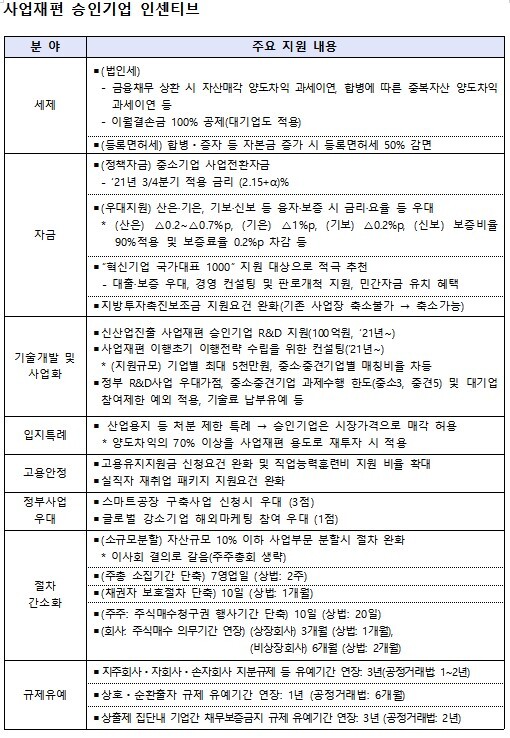 사업재편 승인을 받은 기업들은 상법과 공정거래법의 각종 규제들이 유예되며 절차도 간소화된다. 또 금융, 세제, 고용, R&D 등 다양한 분야의 인센티브가 지원된다.