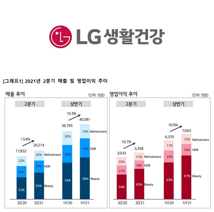 ㈜LG생활건강(대표 차석용)은 2021년 상반기 매출 4조581억원, 영업이익 7063억원, 당기순이익 4852억원을 기록했다. 전년동기대비 각각 10.3%, 10.9%. 10.6% 증가한 수치로, 사상 최대 상반기 실적을 경신했다.