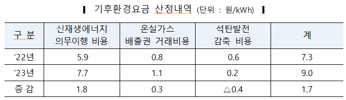 기후환경요금은 신재생의무이행비용, 온실가스배출권비용 등 올해 증가한 비용을 내년에 반영해 kWh당 1.7원 올린다.