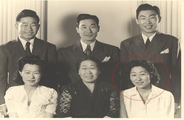 | ▲ 안수산 선생을 비롯한 안창호 선생의 유족 사진이다. 왼쪽 뒷줄부터 안필영, 안필립, 안필선 선생, 앞줄 왼쪽은 안수라, 이혜련, 안수산 선생의 모습이다. [출처= 독립기념관 한국독립운동정보시스템 공개 자료] |