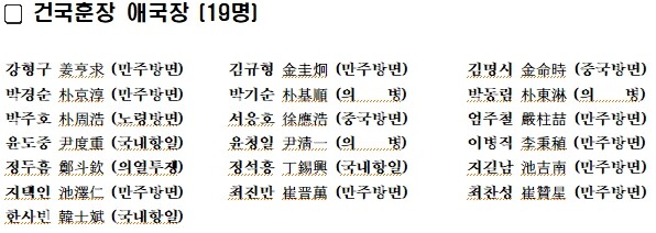 | ▲ 건국훈장 애국장 독립유공자 포상 19명 명단. [국가보훈처 제공] |