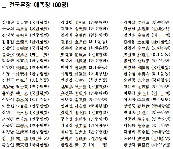 | ▲ 건국훈장 애족장 독립유공자 포상 60명 명단. [국가보훈처 제공] |