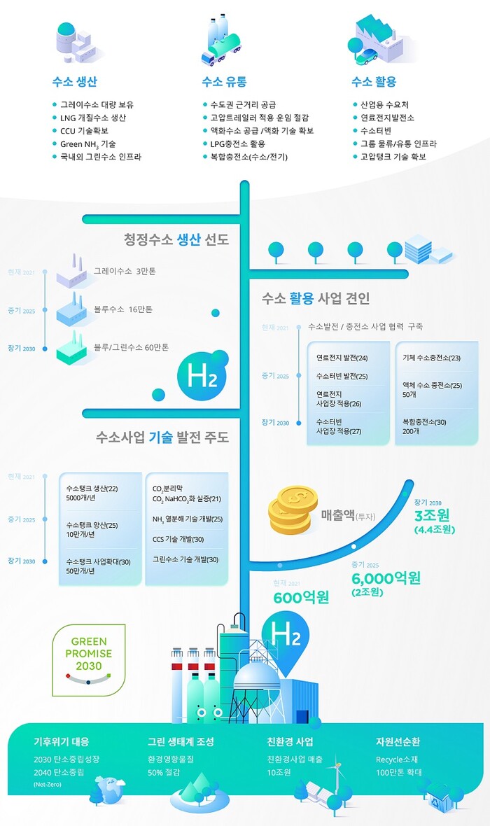 친환경 목표 역시 구체적. 궁극적으론 탄소가 배출되지 않는 '그린수소'를 지향한다. 목표 기한인 2030년까지 연 44만톤 생산 계획.