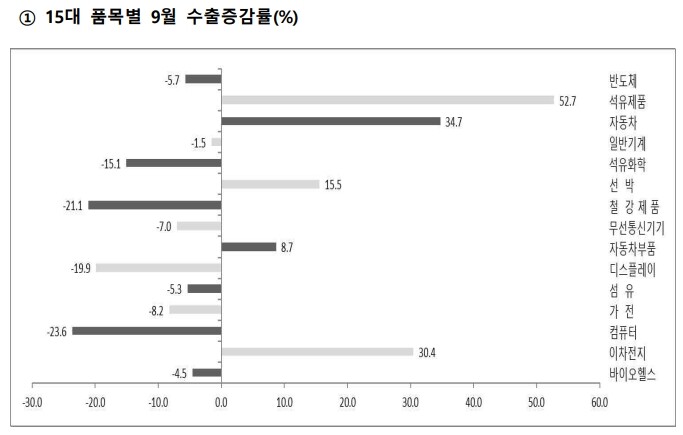 ▲ 15대 주요 품목별 9월 수출증감률. [산업부 제공] |