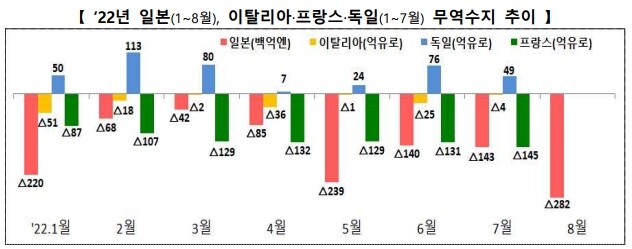 ▲ 올해 일본, 이탈리아, 프랑스, 독일의 무역수지 추이. [산업부 제공] |