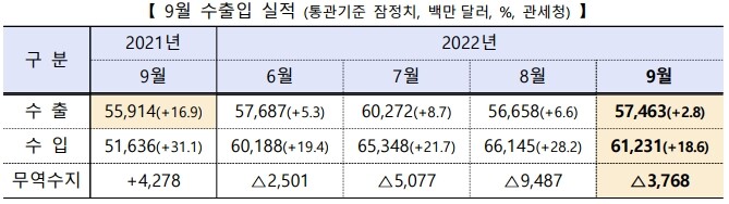 1일 산업통상자원부가 발표한 9월 수출입 통계(통관기준 잠정치)에 따르면, 9월 수출은 전년 동월 대비 2.8% 늘어난 574억6천만 달러였고, 수입은 18.6% 증가한 612억3천만 달러로 집계됐다.
