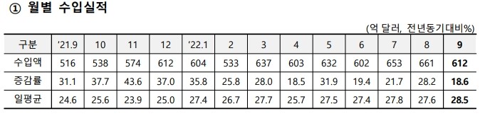 한국의 전체 9월 수입(612억3천만 달러)은 대규모 에너지 수입 등 영향으로 7개월 연속으로 600억 달러대를 기록하며 높은 증가율(18.6%)을 유지했다.