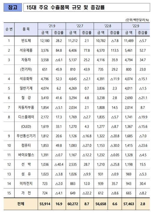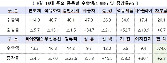 ▲ 9월 15대 주요 품목별 수출액 및 증감률. [산업부 제공] |