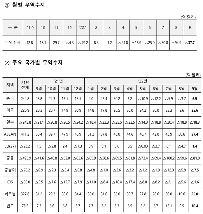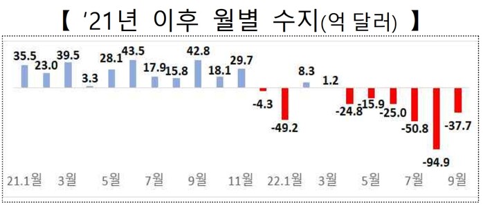 다만 9월 무역수지 적자 규모는 8월(94억9천만 달러)보다는 57억2천만 달러(60.3%) 축소됐다. 수출 규모는 전월과 유사했으나 원유, 석탄, 정밀화학원료 등의 수입액이 전월 대비 줄면서 한 달 전에 비해 거의 3분의 2가량 감소했다.