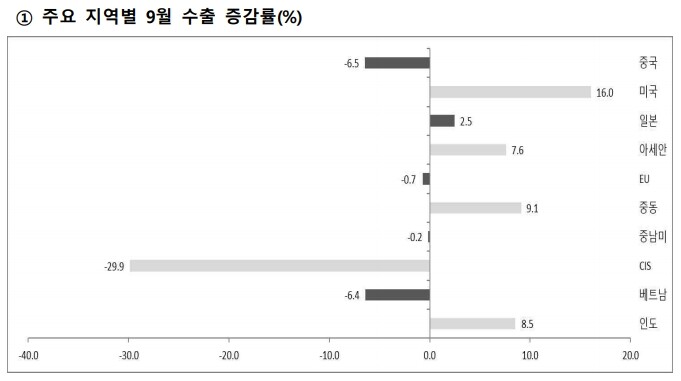 ▲ 주요 지역별 9월 수출 증감률. [산업부 제공] |