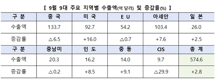 ▲ 9월 9대 주요 지역별 수출액 및 증감률. [산업부 제공] |