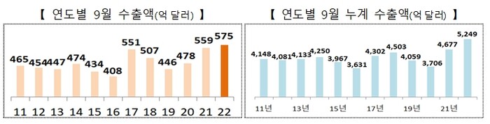 ▲ 연도별 9월 수출액과 누계 수출액. [산업부 제공] |