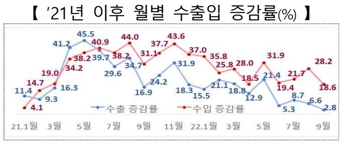 ▲ 2021년 이후 월별 수출입 증감률. [산업부 제공] |