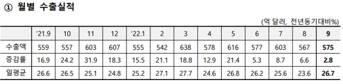 우리나라 9월 수출액(574억6천만 달러)은 역대 최고였던 지난해 9월(559억1천만 달러)을 웃도는 최고치였다.