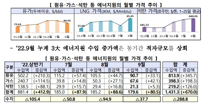 동절기 에너지 수급 안정을 위한 에너지원 조기 확보 등 복합적인 영향으로 수입이 증가했다. 3대 에너지원의 수입 증가액은 무역 적자 규모(37억7천만달러)의 두 배를 넘는 수준이다.