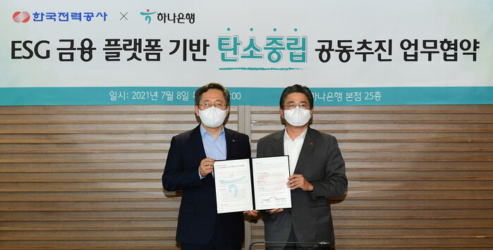 한국전력(대표이사 사장 정승일)과 하나은행(은행장 박성호)은 8일 '금융플랫폼 기반 탄소중립 공동추진'을 위한 업무협약을 체결했다.