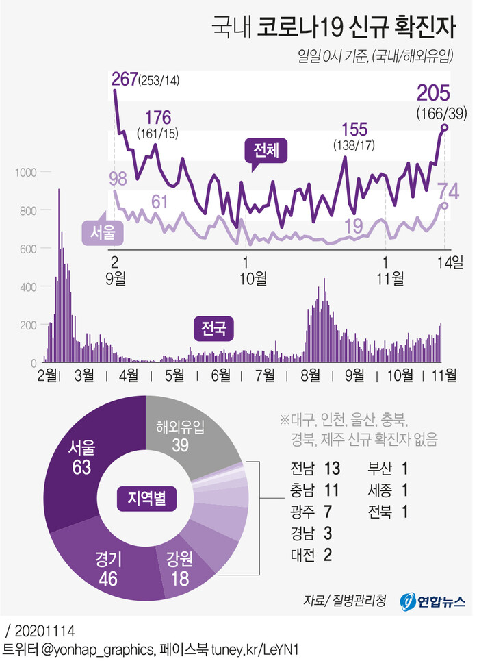 전날 신규 확진자 205명의 감염경로를 보면 지역발생이 166명, 해외유입이 39명이었다. 지역발생 확진자는 전날(162명)보다 4명이나 늘었다. 지역발생 166명은 지난 9월 4일(189명) 이후 71일만에 가장 많은 수치였다.