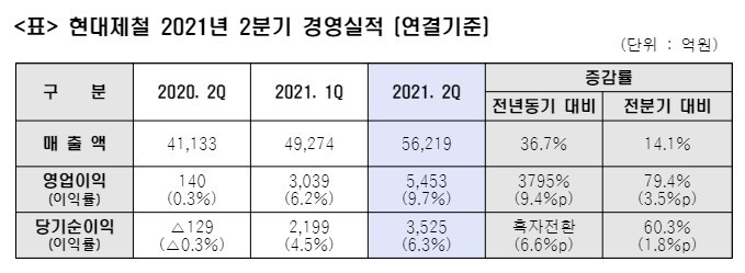현대제철의 2021년 2분기 경영실적은 연결기준 매출액 5조6219억원, 영업이익 5453억원을 기록했다.
