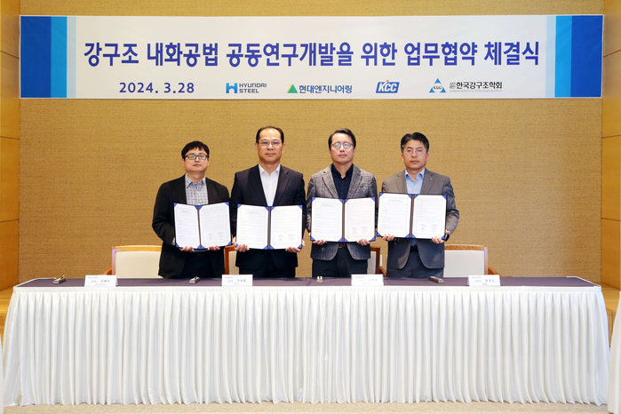 KCC는 28일 충남 당진에 위치한 현대제철 연수원에서 현대제철, 현대엔지니어링, 한국강구조학회 관계자들이 참석한 가운데, 강구조(steel structure)의 효과적인 내화공법을 위한 업무협약을 체결하고 각 기관의 업무R&R과 향후 계획에 대해 논의했다. 공동 연구개발 목적은 내화 도막 두께를 절감시킨 신규내화공법을 개발해 기존의 방식보다 시공 효율성을 높여 모듈러 건축 시장을 보다 활성화시키기 위함이다.