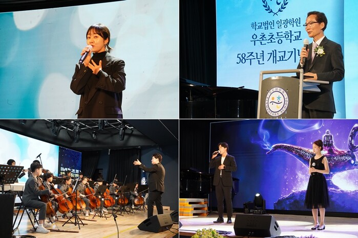 이날 행사는 꿈을 갖도록 학생들을 격려하는 강준민 목사(미국 새생명 비전교회)의 격려 말씀을 비롯해, 교장 기념사, 학교법인 이사장 인사말, 교직원 특별상 수여, 케이크 커팅 순으로 진행됐다. 이어 우촌 오케스트라 단원들의 연주, 우촌초 뮤지컬 강사인 이대훈(뮤지컬 배우), 김보라(뮤지컬 배우)의 듀엣, 그리고 초청가수 뮤지컬 배우 선우의 축하 무대로 꾸며졌다.