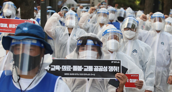 ▲기자회견 후 방역복 차림으로 민주노총 동시 결의대회에 참석한 보건의료노조 조합원들 (사진 = 연합뉴스 제공) |