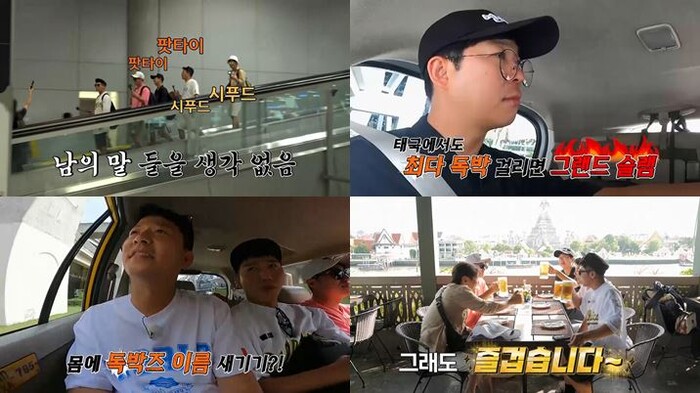 앞서 베트남, 대만에 이어 이번엔 태국 방콕으로 향한 ‘독박즈’ 5인은 현지 공항에 도착하자마자 “사와디캅!”을 외치며 설렘과 흥분을 분출시킨다. 이어 이들은 키오스크로 능숙하게 택시 승차권을 발급받은 뒤, 차 안에서 두런두런 이야기꽃을 피운다. 이때 막내 홍인규는 이전 여행에서의 ‘최다 독박자’였던 유세윤을 향해 “형 여기서 또 독박 걸리면, 그랜드슬램 달성이야~”라며 팩폭을 투척한다. 김준호도 “머리도 깎고, 취두부도 먹고~”라고 흥얼거리며, 이전 ‘최다 독박자’ 유세윤이 당했던 베트남식 이발과 대만 취두부 먹방을 떠올리게 한다.