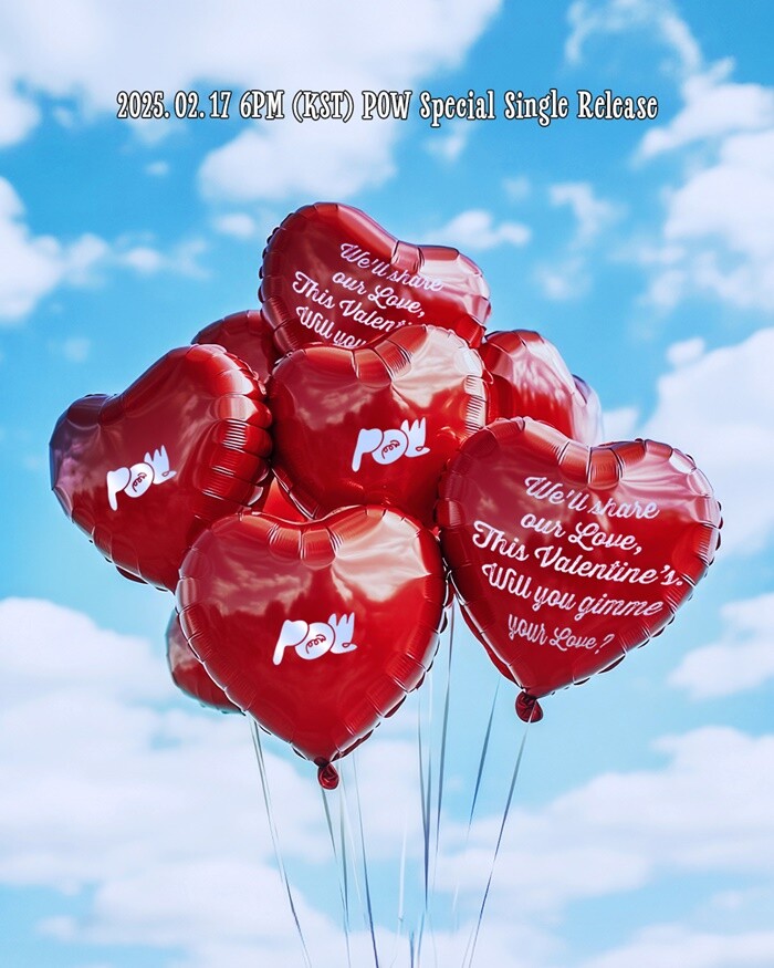 파우(POW)는 5일 공식 SNS 채널을 통해 싱글 ‘Gimme Love’의 무드를 엿볼 수 있는 포스터를 공개하며 신곡에 대한 궁금증을 자극했다. 구름이 예쁘게 수놓인 청량한 하늘을 배경으로 그룹명 ‘POW’와 ‘We'll share our Love, This Valentine's. Will you gimme your Love?’라는 메시지가 담긴 붉은색 풍선이 시선을 사로잡는다. 강렬한 레드와 하늘색이 대비를 이루며 달콤하면서도 임팩트 있는 ‘파우(POW)표 음악’에 대한 기대를 고조시켰다.