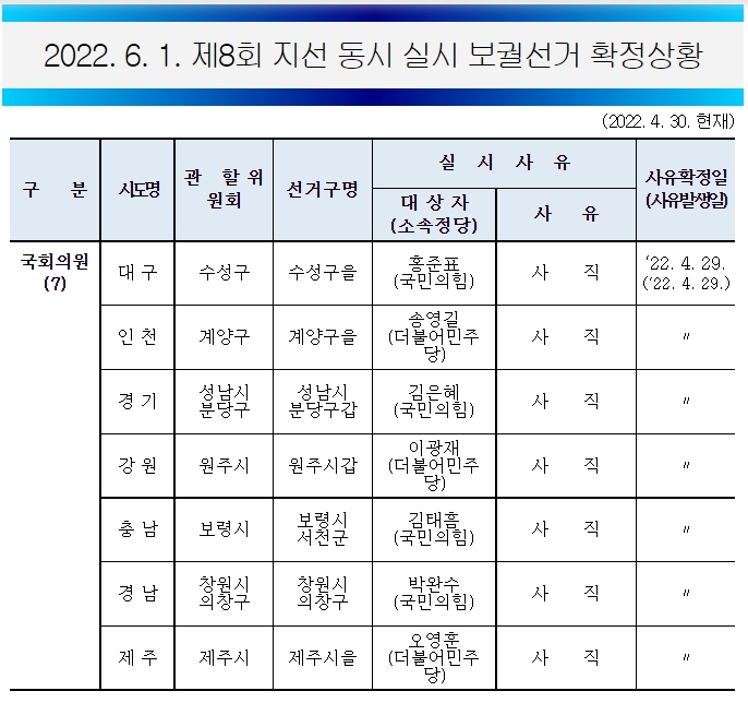 | ▲ 제8회 지방선거 동시 실시 보궐선거 지역 7곳과 실시사유. [중앙선거관리위원회 제공] |