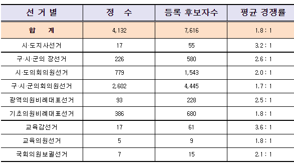 전국 17개 광역단체장을 뽑는 시·도지사선거에는 55명이 등록해 3.2대1를, 226명을 뽑는 기초단체장(구·시·군의 장) 선거에는 580명이 등록해 2.6대1의 경쟁률을 각각 기록했다.