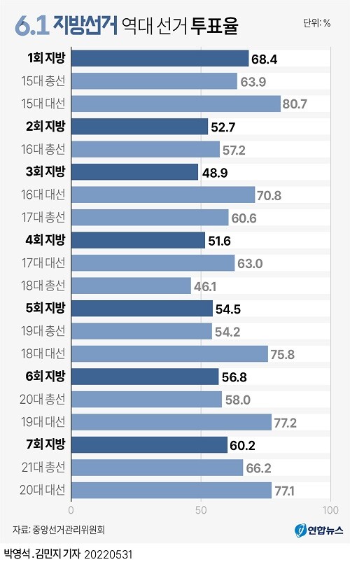 | ▲ 역대 지방선거 투표율. [그래픽=연합뉴스] |