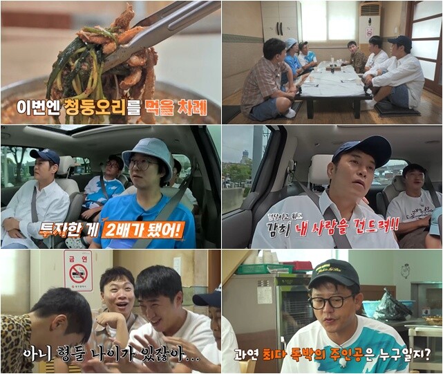 든든히 배를 채운 6인은 곧장 이상준이 극찬한 ‘애호박찌개’를 먹으러 이동한다. 한시도 쉬지 않고 먹방 투어를 이어가는 ‘독박즈’는 과거 이상준이 히트시킨 코너 ‘사망토론’에 대한 추억을 떠올리며 “가장 박빙이었던 주제가 뭐였지?”라고 묻는다. 이상준은 잠시 고민하더니, “아내 몰래 코인에 1억 원을 투자했는데, 두 배가 됐다면 아내에게 말할 것인지?”라고 모두에게 질문을 던진다. 그러자 김대희는 “난 아내에게 솔직히 말하고 반은 줄 것 같다”고 털어놓고, 홍인규는 “난 절대로 말 안한다. 아내가 나한테 잘 해줄 때마다 용돈처럼 줄 것”이라고 해 모두를 폭소케 한다. 기세를 몰아 이상준은 “운전대를 잡은 아내에게 옆 차의 건달이 침을 뱉는다면?”이라고 묻는다. 난감한 토론 주제에 모두가 망설이던 때, 김준호는 “무조건 싸워야지!”라고 외쳐 ‘상남자’ 매력을 내뿜는다. 그러나 이내 반전 설명을 늘어놓아 ‘독박즈’의 실소를 유발한다. ‘건달’ 이야기가 나오자 홍인규는 “예전에 건달이랑 시비 붙었을 때가 있었는데, 세윤이가 도망가 버렸다”고 깜짝 폭로한다. 당황한 유세윤은 “원래 연예인은 구설에 휘말리면 안 되어서”라고 다급히 수습에 나선다.
