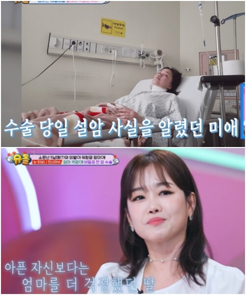 특히 정미애는 최근 설암 3기 판정을 받고 수술을 할 당시 어머니에게 알리지 못했다고 털어놨다. 정미애는 "수술 당일 설암 사실을 알렸다. 엄마가 걱정돼서 선뜻 말을 못하겠더라"라고 고백했다.
