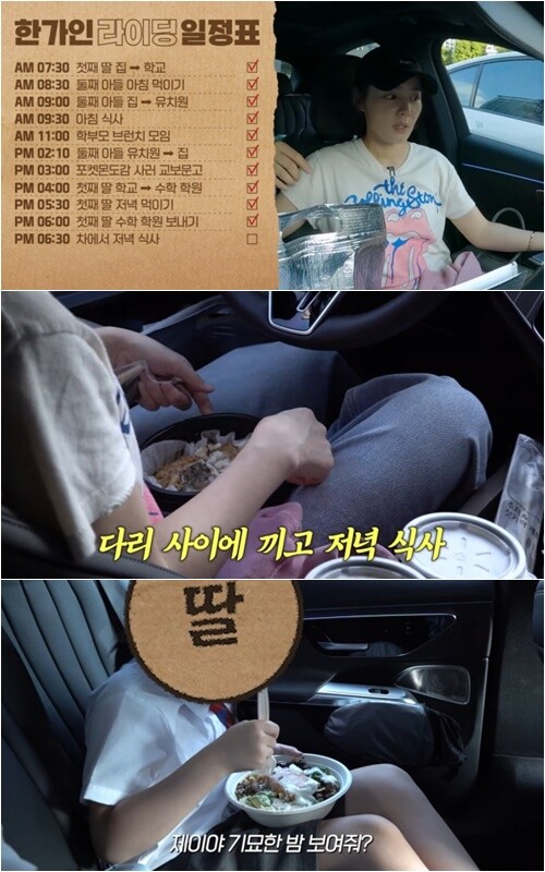 곧이어 한가인은 첫째 딸을 학교에 데려다준 후, 둘째 아들을 유치원에 데려다주기 위해 이동했다. 이후 귀가해 오전 9시30분 혼자 아침식사를 한후, 지인들과 브런치 타임을 즐겼다. 이후에도 쉼없는 육아 스케줄을 이어가 놀라움을 자아냈다. 심지어 첫째딸과 저녁을 차에서 해결하기도.