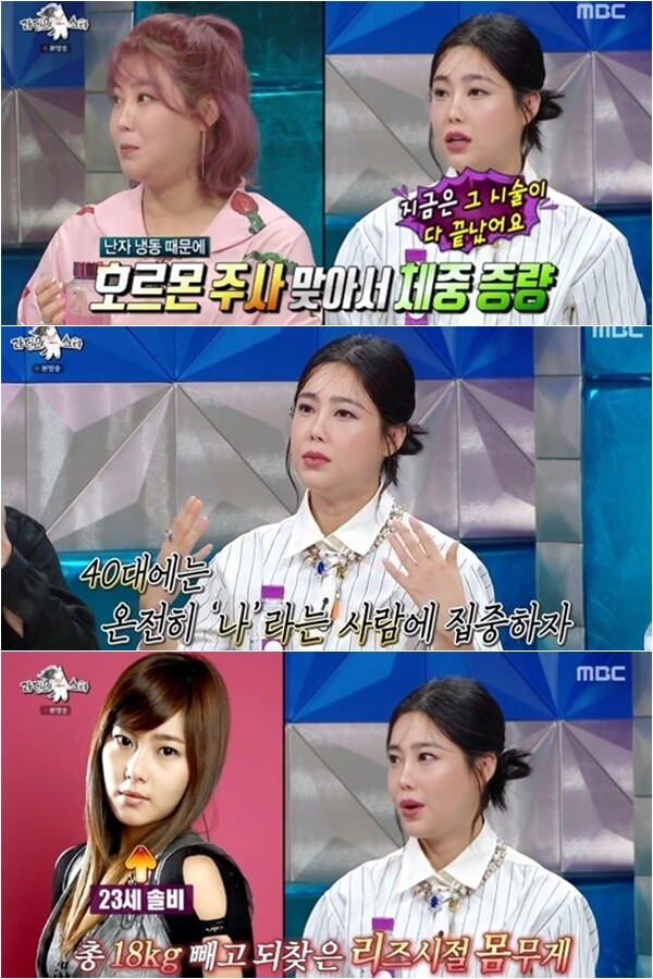 솔비는 "지난 출연 때는 난자 냉동 때문에 호르몬 주사를 맞느라 부어서 나왔다. 현재는 난자 냉동 시술 후 운동으로 체중을 관리했다"고 밝혔다.