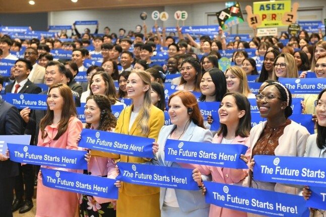 ▲포럼에 참석한 세계 각국 ASEZ 회원들이 ‘The Future Starts Here’라고 적힌 피켓을 들어 보이며 지속 가능한 미래를 향한 실천 의지를 다졌다. |