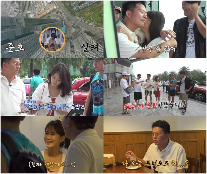 이날 ‘독박즈’는 81층 높이의 전망대에 올라, 호찌민 시내의 파노라마 절경을 제대로 즐긴다. 그러던 중 김지민이 게스트로 몰래 찾아오고, 혼자 VR 체험을 하느라 정신이 없는 김준호는 눈앞에 김지민이 나타났음에도 “이게 뭐야?”라며 리액션 고장을 일으킨다. 김준호의 뜨뜻미지근한 반응에 서운해한 김지민은 “(내가 왔는데도) 별로 안 좋아하는 것 같은데?”라고 투덜거리고, 이에 김준호는 “다시 찍자!”라고 하더니, “지민아 사랑해”라고 박력 있게 고백한 뒤 김지민을 다정히 안아 ‘독박즈’를 폭소케 한다.