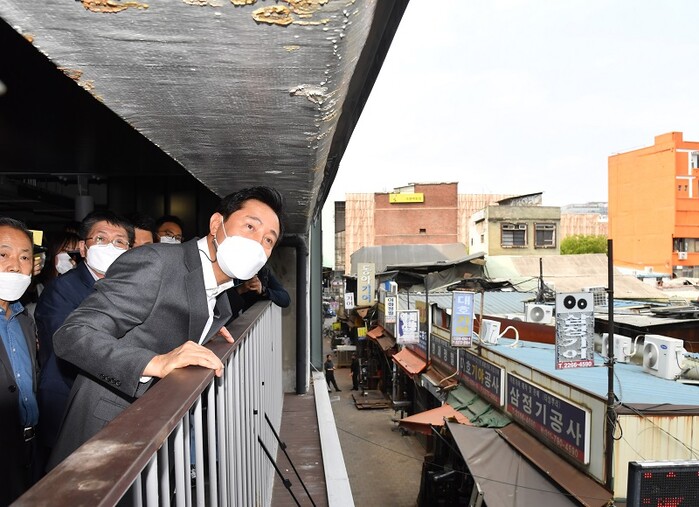▲ 오세훈 서울시장이 21일 서울 중구 세운재정비촉진지구 세운5구역 현장을 둘러보고 있다. [서울시 제공]