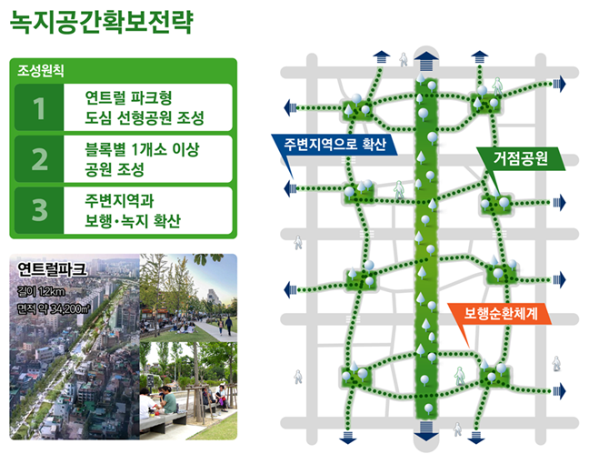 녹지공간 확보를 위해 블록별로 최소 1개 이상의 공원을 조성하고 공원과 공원은 녹지 보행로 등으로 연결한다. 또 연결된 녹지는 인근 지역까지 넓혀 도심 전체를 순환하는 녹지 네트워크를 구축하는 것이 녹지생태도심 전략의 원칙이다.