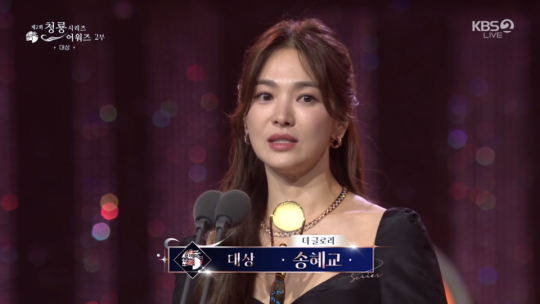 | ▲ 송혜교가 제2회 청룡시리즈어워즈에서 대상을 차지했다. [사진=kbs2 캡처] |
