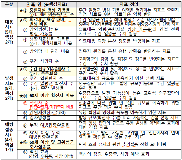이들 17개 지표 가운데 ‘대응지표’ 중 ‘중환자실 병상가동률’과 ‘의료역량 대비 발생 비율’ 등 2개, ‘발생지표’ 중 ‘주간 신규 위중증환자 수’와 ‘60세 이상 확진자 비율’ 등 2개, ‘접종지표’ 중 ‘60세 이상 고위험군 추가접종률’ 1개 등 모두 5개는 위험도 평가의 ‘핵심지표’로 삼는다.