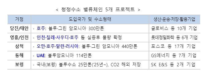 이미 추진되고 있는 청정수소 밸류체인 5개 프로젝트의 참여 기업과 주요 거점지역, 프로젝트 내용은 아래 표와 같다.
