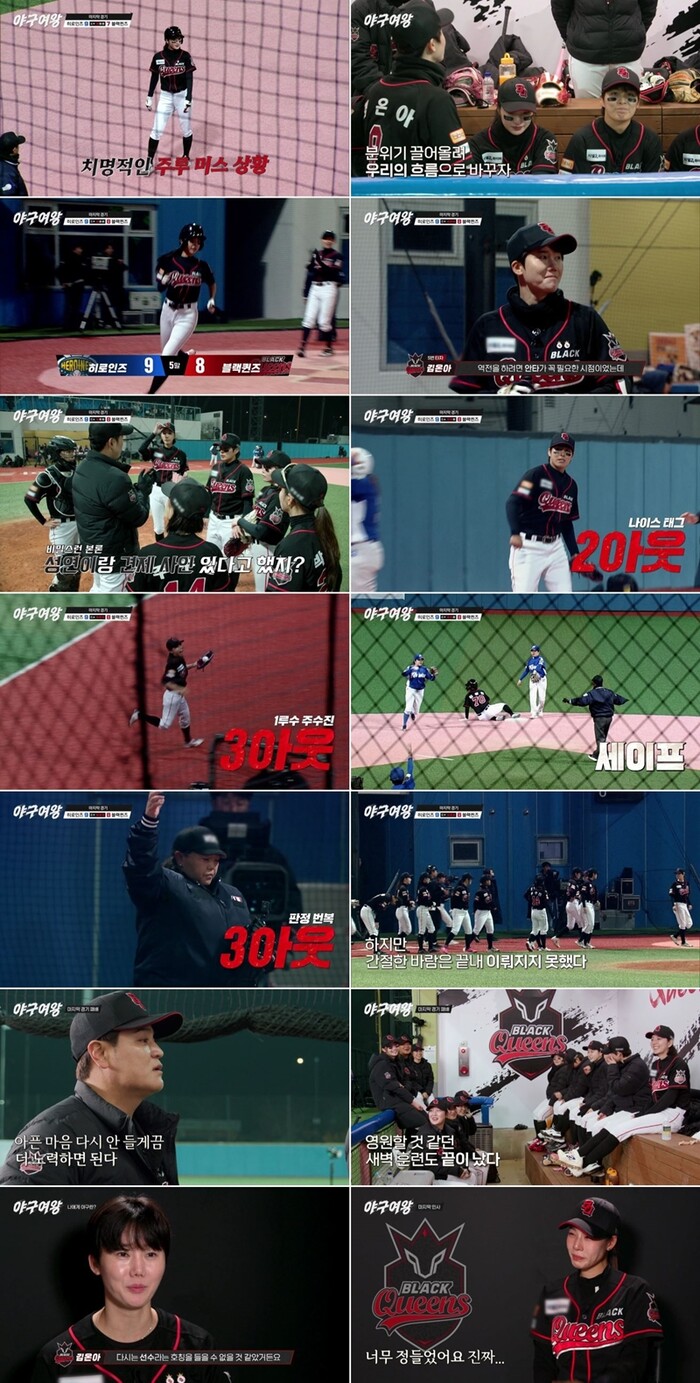 3일 방송된 채널A ‘야구여왕’ 최종회에서는 ‘레전드 선출’ 김민지-김보름-김성연-김온아-박보람-박하얀-송아-신소정-신수지-아야카-이수연-장수영-정유인-주수진-최현미가 뭉친 국내 50번째 여자 야구단 블랙퀸즈가 히로인즈와의 최종 8차전에서 역대급 혈투를 벌이는 모습이 그려졌다. 이날 블랙퀸즈는 사전 연습한 ‘견제 사인’에 맞춰 히로인즈의 주자를 완벽하게 잡아내며 한 차원 달라진 모습을 보였지만, 끈질긴 추격에도 불구하고 9:8로 아쉬운 패배를 맛봤다.