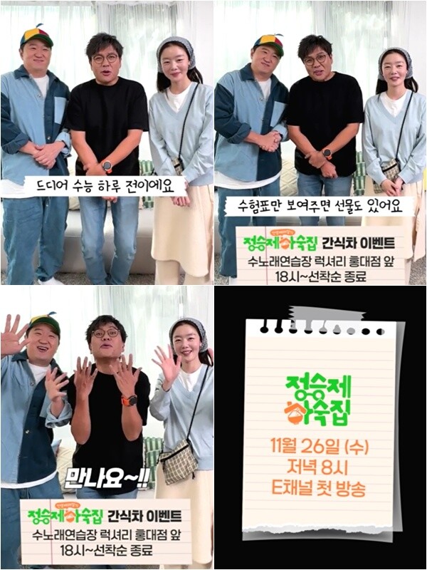 제작진은 “수능을 앞둔 수험생들을 위해 ‘하숙집 이모’ 정승제, 정형돈, 한선화가 따뜻한 응원의 메시지를 보냈다. 더불어 ‘간식차 이벤트’도 진행하는데, 현장에서 ‘하숙집 이모’ 3인의 포토카드와 붕어빵, 한정판 굿즈 등을 최초 공개 및 증정할 예정이니 많은 기대와 응원 부탁드린다”고 밝혔다.