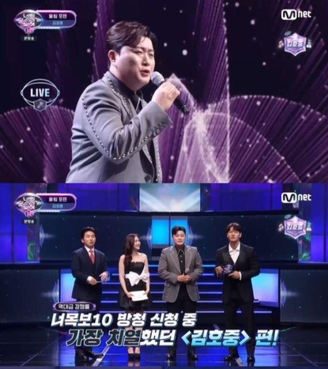 ‘너목보10’의 게스트로 출격한 김호중은 ‘빛이 나는 사람’을 라이브로 부르며 스페셜하게 등장, ‘트바로티’의 클래스를 보여줬다. 라이브 무대로 등장한 김호중에 ‘너목보10’ 스튜디오는 순식간에 팬클럽 아리스의 보랏빛으로 물들여져 감동을 더했다.