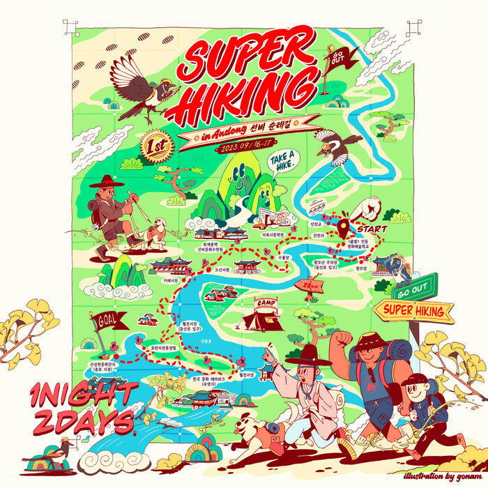 ‘고아웃 슈퍼하이킹’은 ‘아름다운 풍경’이라는 테마를 중심으로 자연의 소중함과 특별한 아웃도어 경험을 전하는 신개념 하이킹 프로그램이다. 9월 16일부터 1박 2일간 경북 안동시 선비순례길 일대에서 진행되며, 안동영화예술학교에서 출발해 단천교-퇴계종택-도산서원-월천서당-한국문화테마파크-선상수상길-선성현문화단지까지 약 28km 코스다.