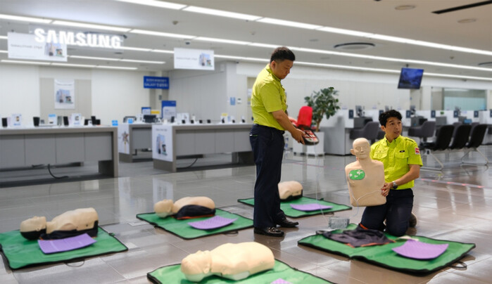 삼성전자서비스는 갑작스러운 심정지 상황에서 고객과 임직원을 보호하기 위해 2019년부터 매년 응급처치 실습 교육을 진행하고 있다.