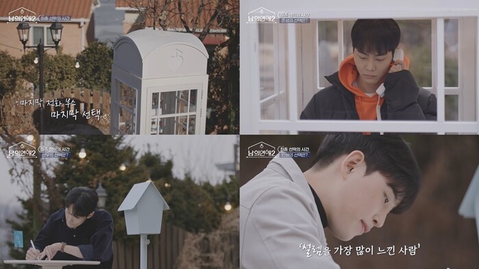 최종 선택 전, 마지막 음성 메시지를 통해 솔직한 마음을 전한 이들은 “왠지 모르게 울컥했다”며 진심을 다했던 ‘남의 집’에서의 8일을 마무리했다. 한편, 성호를 향해 직진하던 준성은 전화부스에서 “아 내가 기대를 너무 많이했구나”라며 얼어 붙었다고해 최종 결과에 대한 궁금증이 수직 상승한다.