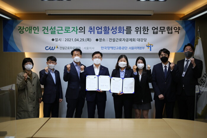 한국장애인고용공단 서울지역본부(본부장 이재구)와 건설근로자공제회 서울지사(지사장 이재금)는 장애인 고용촉진강조기간인 45월을 맞아 장애인 건설근로자 취업활성화를 위한 업무협약을 29일 체결했다.