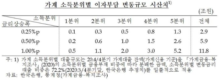 한국은행은 전체 가계대출 중 3, 6개월 단위로 금리를 조정하는 변동금리 대출 비중을 72%로 추정했다. 이 가계대출 잔액에 금리 인상폭(1%포인트)을 곱해 추가 이자 부담 11조8000억원을 산출했다. 대출액이 가장 많은 소득 상위 20%(5분위)가 5조2000억원을 추가 부담해야 하는 것으로 나타났다. 나머지 1~4분위는 6조6000억원의 이자를 더 물어야 한다.
